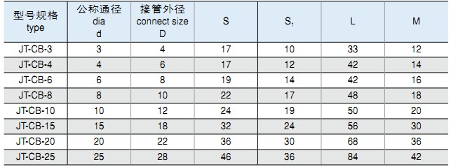 安裝及應用一、JT系列卡套式管接頭適用于有色金屬管,編織尼龍管的連接。最大工作壓力為1.0MPa。二、氣管切斷后,管口修平去毛刺。將氣管插入接頭內(一定要插到底)然后旋緊管帽。當管子已不能轉動時,再繼續旋緊1/3圈,即可牢固連接和密封。三、該